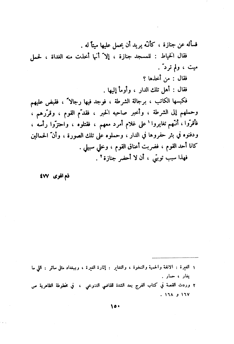 فكبسها الكاتب، برجالة الشرطة، فوجد فيها رجالا، فقبض عليهم وحملهم إلى الشرطة، وأخبر صاحبه الخبر، فقدّم القوم، وقرّرهم، فأقرّوا، أنّهم تغايروا «1» على غلام أمرد معهم، فقتلوه، واحتزّوا رأسه، ودفنوه في بئر حفروها في الدار، وحملوه على تلك الصورة، وأنّ الحمالين كانا أحد القوم، فضربت أعناق القوم، وخلي سبيلي.