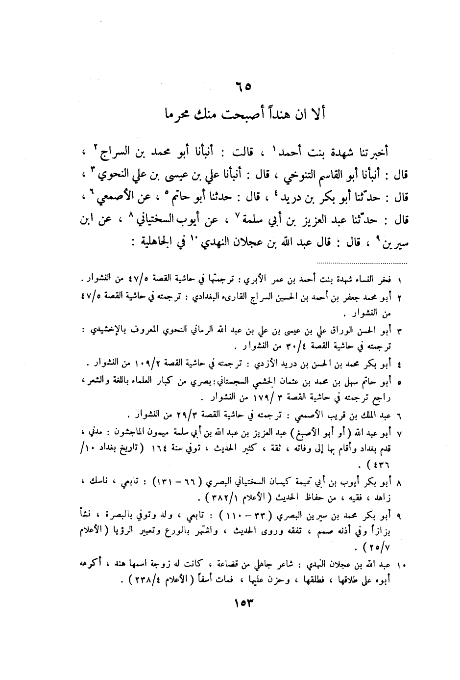 أخبرتنا شهدة بنت أحمد «1» ، قالت: أنبأنا أبو محمد بن السراج «2» ، قال: أنبأنا أبو القاسم التنوخي، قال: أنبأنا علي بن عيسى بن علي النحوي «3» ، قال: حدّثنا أبو بكر بن دريد «4» ، قال: حدثنا أبو حاتم «5» ، عن الأصمعي «6» ، قال: حدّثنا عبد العزيز بن أبي سلمة «7» ، عن أيوب السختياني «8» ، عن ابن سيرين «9» ، قال: قال عبد الله بن عجلان النهدي «10» في الجاهلية: