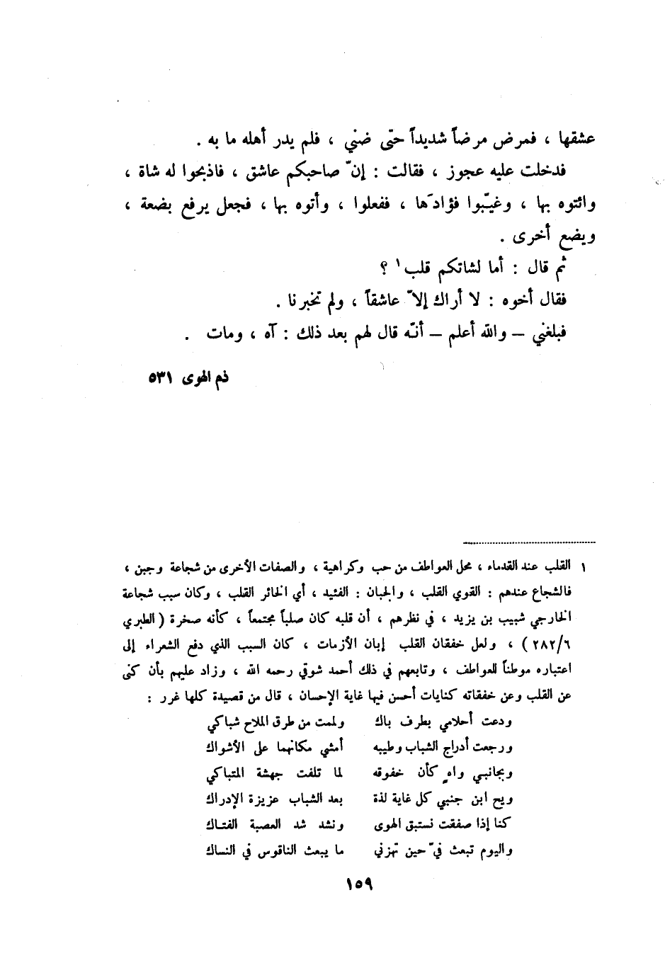 فدخلت عليه عجوز، فقالت: إنّ صاحبكم عاشق، فاذبحوا له شاة، وائتوه بها، وغيّبوا فؤادها، ففعلوا، وأتوه بها، فجعل يرفع بضعة، ويضع أخرى.