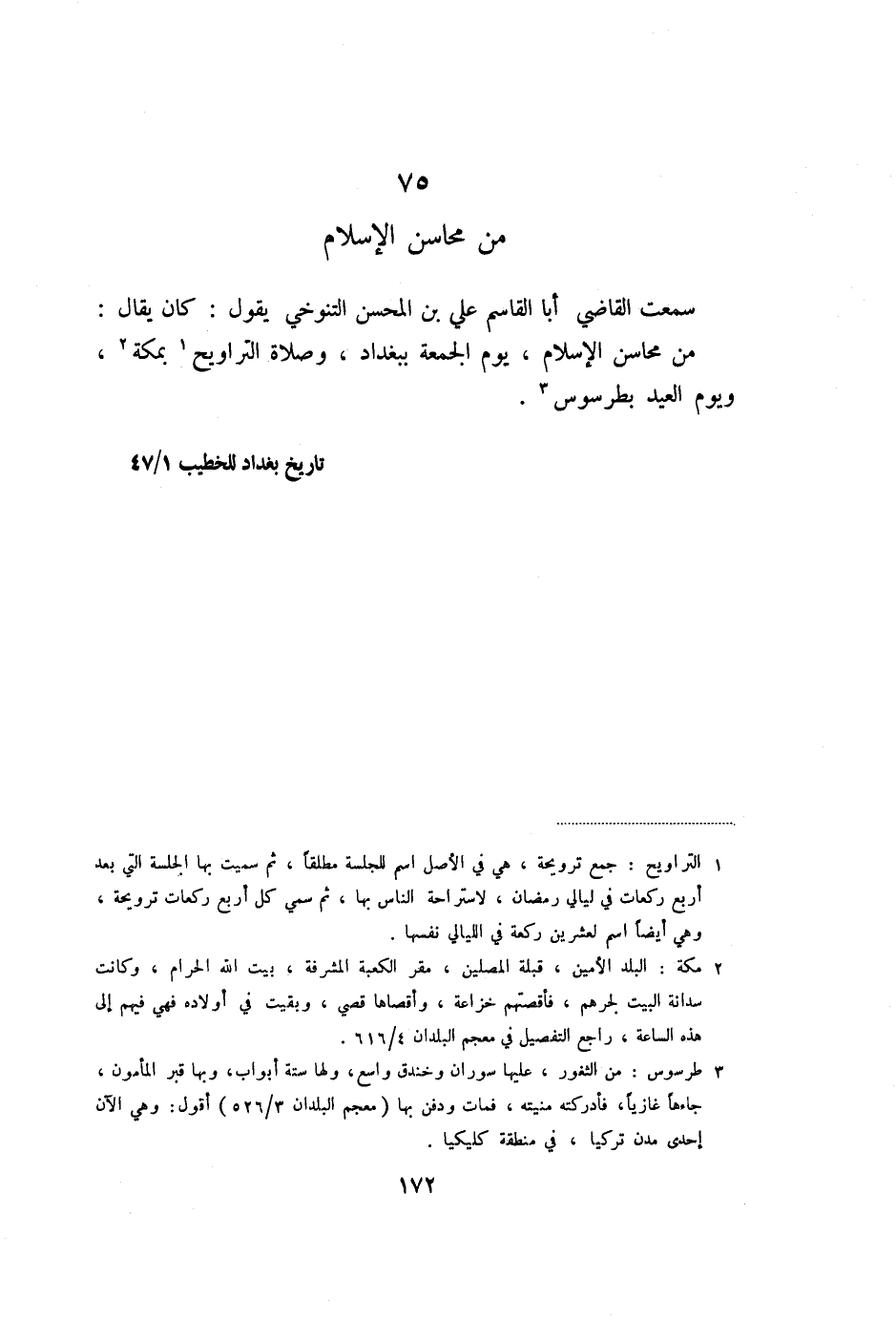 من محاسن الإسلام، يوم الجمعة ببغداد، وصلاة التراويح «1» بمكة «2» ، ويوم العيد بطرسوس «3» .