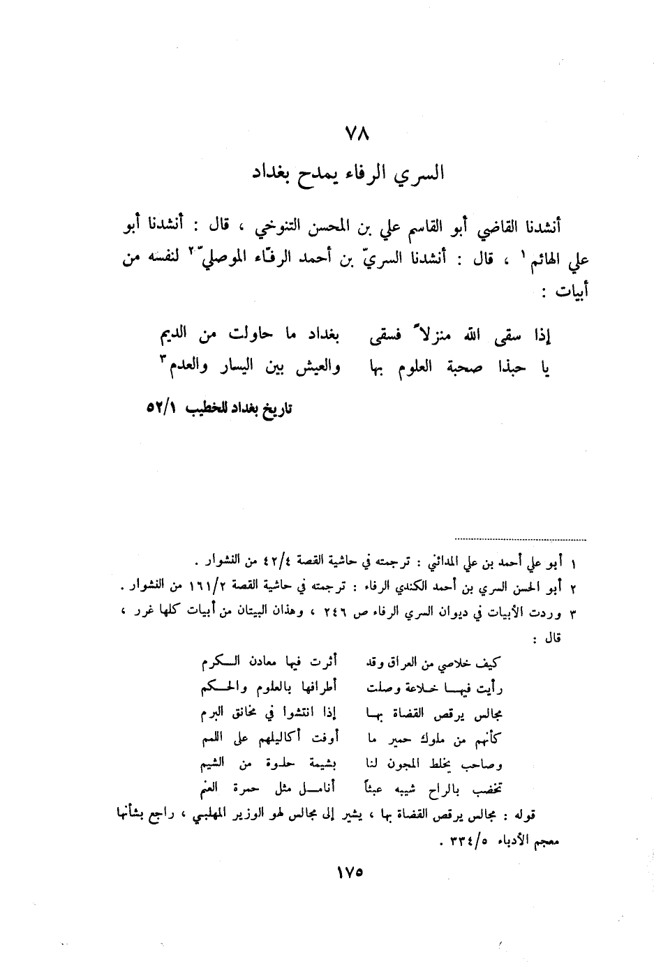أنشدنا القاضي أبو القاسم علي بن المحسن التنوخي، قال: أنشدنا أبو علي الهائم «1» ، قال: أنشدنا السريّ بن أحمد الرفّاء الموصلّي «2» لنفسه من أبيات:
