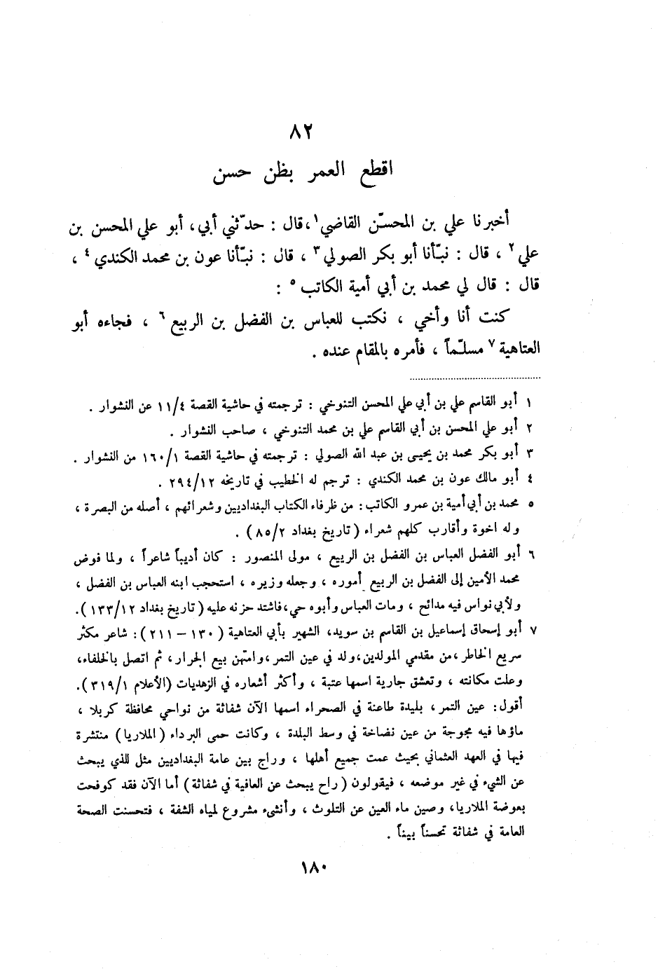 أخبرنا علي بن المحسّن القاضي «1» ، قال: حدّثني أبي، أبو علي المحسن بن علي «2» ، قال: نبّأنا أبو بكر الصولي «3» ، قال: نبّأنا عون بن محمد الكندي «4» ، قال: قال لي محمد بن أبي أمية الكاتب «5» :