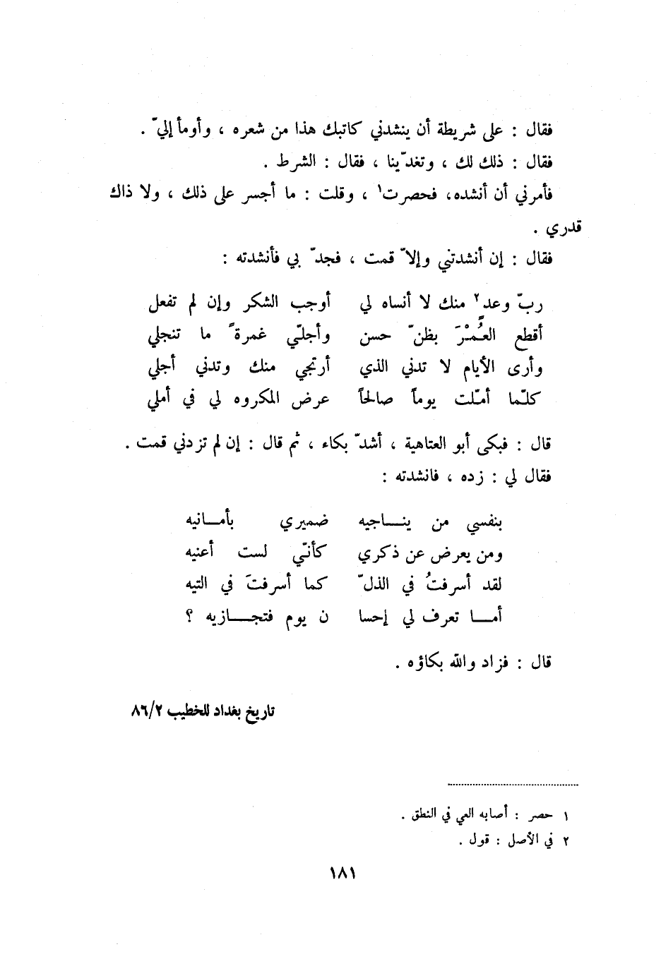 قال: فبكى أبو العتاهية، أشدّ بكاء، ثم قال: إن لم تزدني قمت.