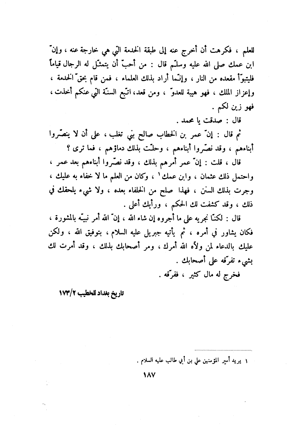 قال، قلت: إنّ عمر أمرهم بذلك، وقد نصّروا أبناءهم بعد عمر، واحتمل ذلك عثمان، وابن عمك «1» ، وكان من العلم ما لا خفاء به عليك، وجرت بذلك السنن، فهذا صلح من الخلفاء بعده، ولا شيء يلحقك في ذلك، وقد كشفت لك الحكم، ورأيك أعلى.