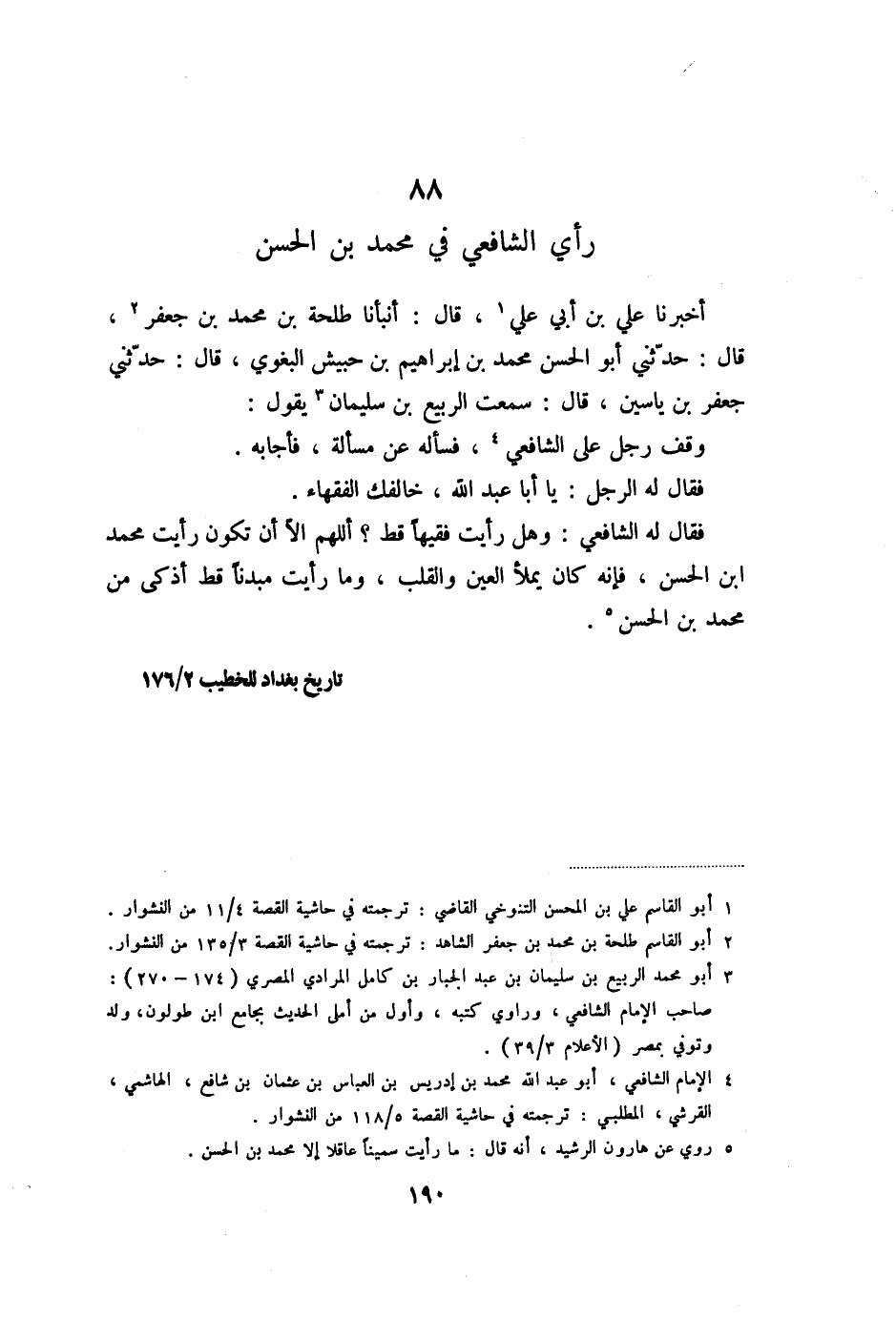 فقال له الشافعي: وهل رأيت فقيها قط؟ أللهم الّا أن تكون رأيت محمد ابن الحسن، فإنه كان يملأ العين والقلب، وما رأيت مبدنا قط أذكى من محمد بن الحسن «5» .