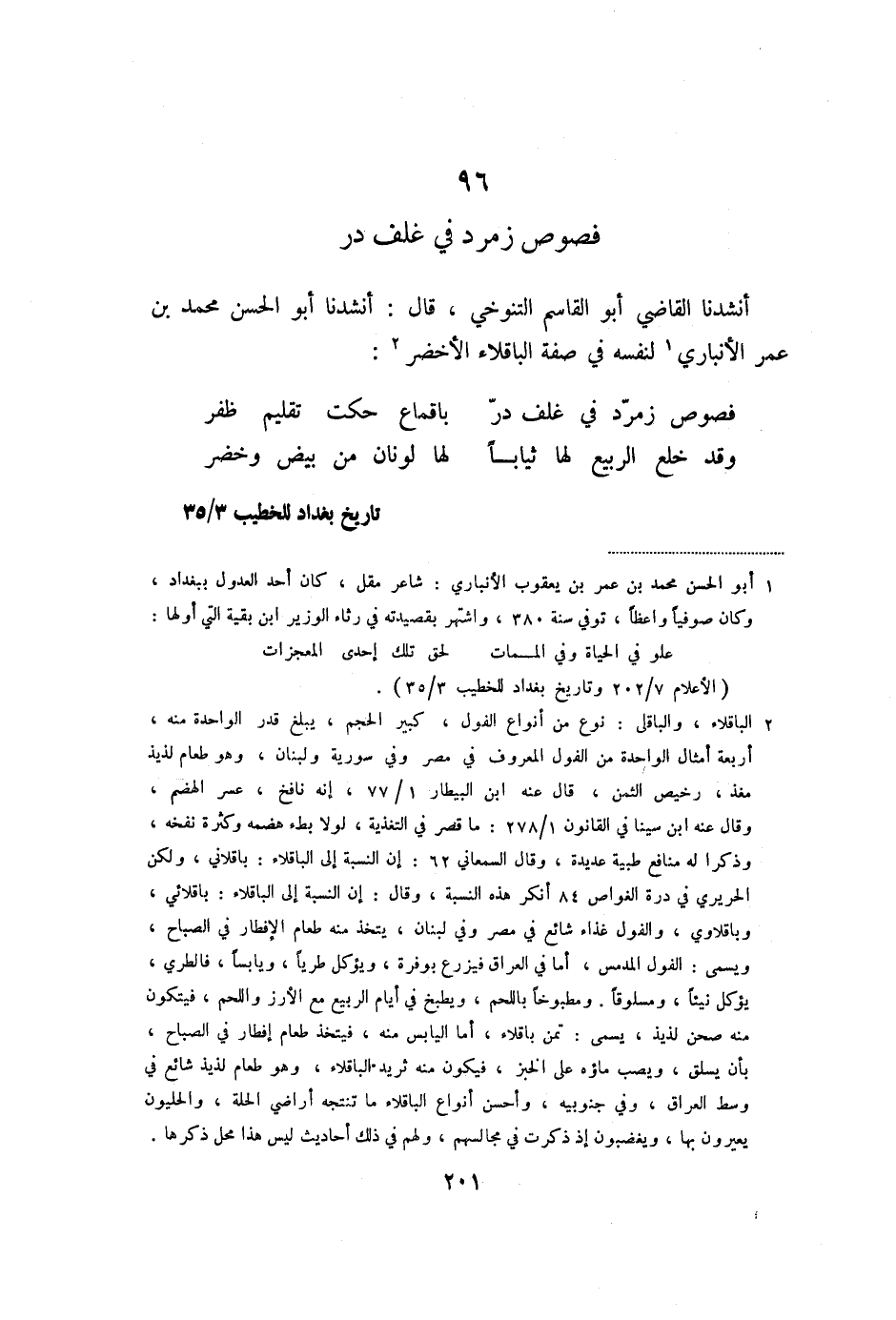 أنشدنا القاضي أبو القاسم التنوخي، قال: أنشدنا أبو الحسن محمد بن عمر الأنباري «1» لنفسه في صفة الباقلاء الأخضر «2» :