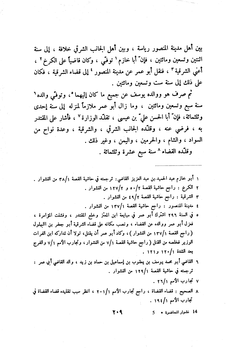 بين أهل مدينة المنصور رياسة، وبين أهل الجانب الشرقي خلافة، إلى سنة اثنتين وتسعين ومائتين، فإنّ أبا خازم «1» توفّي، وكان قاضيا على الكرخ «2» ، أعني الشرقية «3» ، فنقل أبو عمر عن مدينة المنصور «4» إلى قضاء الشرقية، فكان على ذلك إلى سنة ست وتسعين ومائتين.