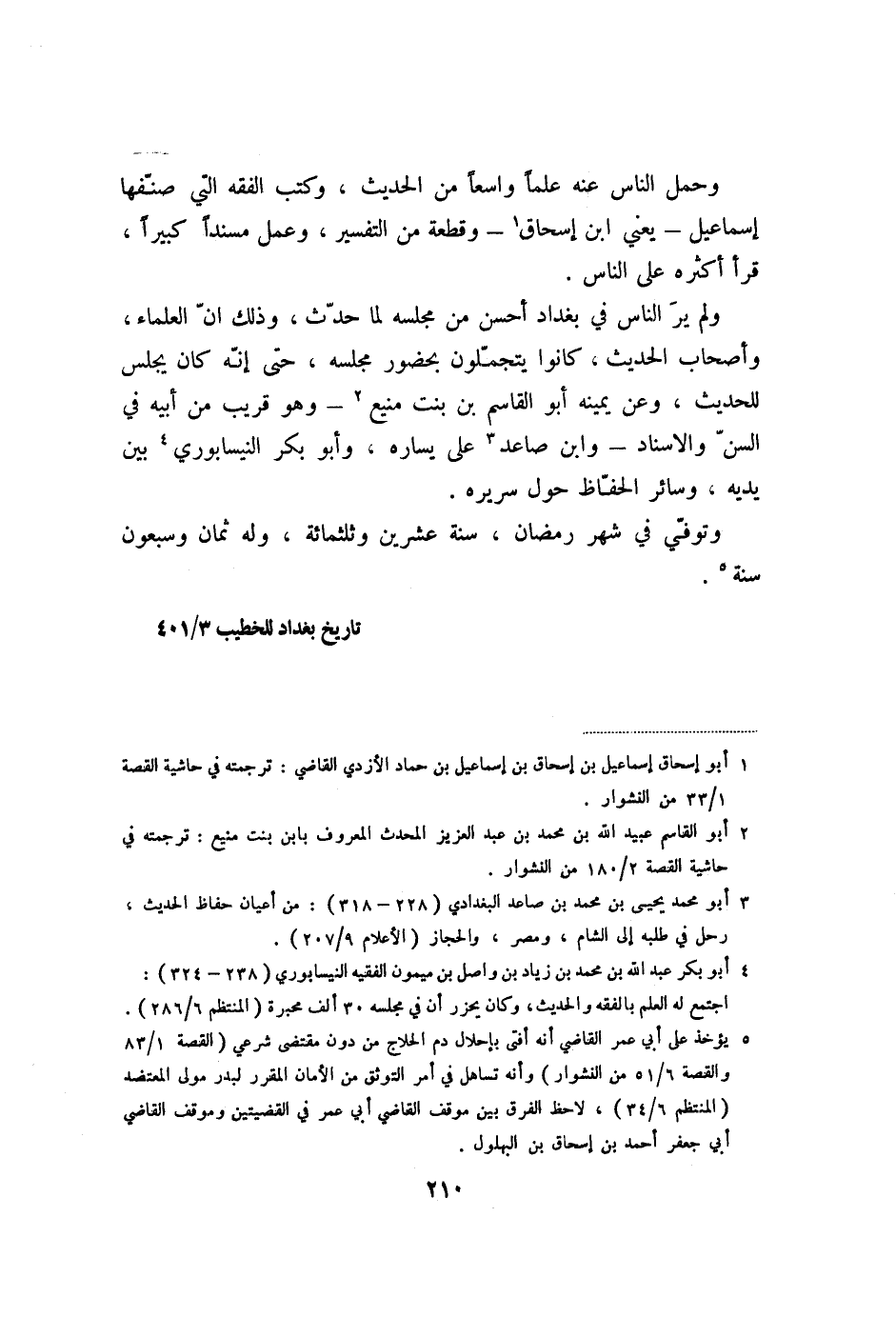 ولم ير الناس في بغداد أحسن من مجلسه لما حدّث، وذلك انّ العلماء، وأصحاب الحديث، كانوا يتجمّلون بحضور مجلسه، حتى إنّه كان يجلس للحديث، وعن يمينه أبو القاسم بن بنت منيع «2» - وهو قريب من أبيه في السنّ والاسناد- وابن صاعد «3» على يساره، وأبو بكر النيسابوري «4» بين يديه، وسائر الحفّاظ حول سريره.