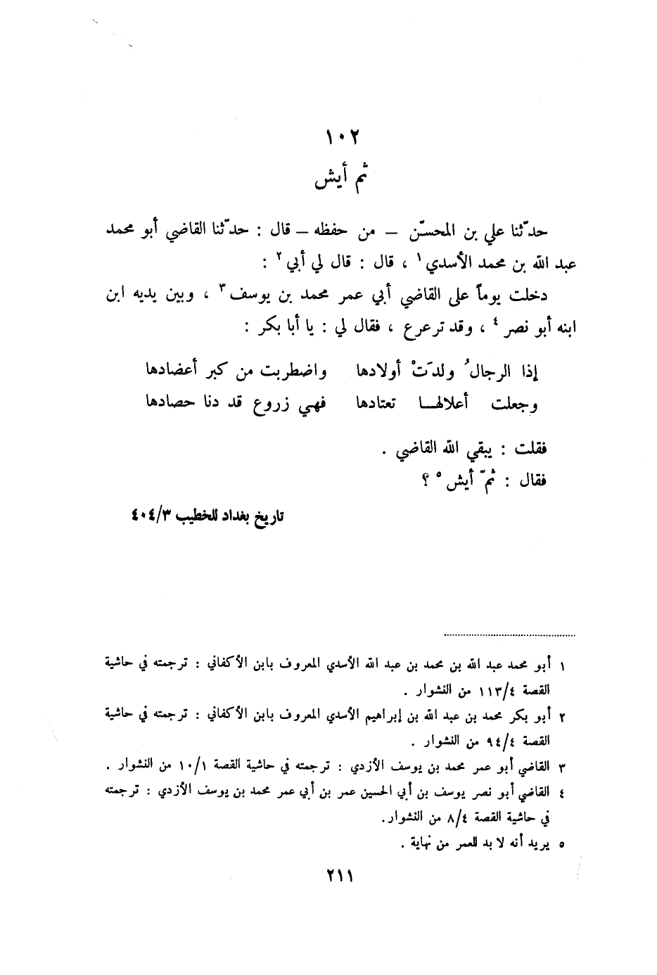 حدّثنا علي بن المحسّن- من حفظه- قال: حدّثنا القاضي أبو محمد عبد الله بن محمد الأسدي «1» ، قال: قال لي أبي «2» :