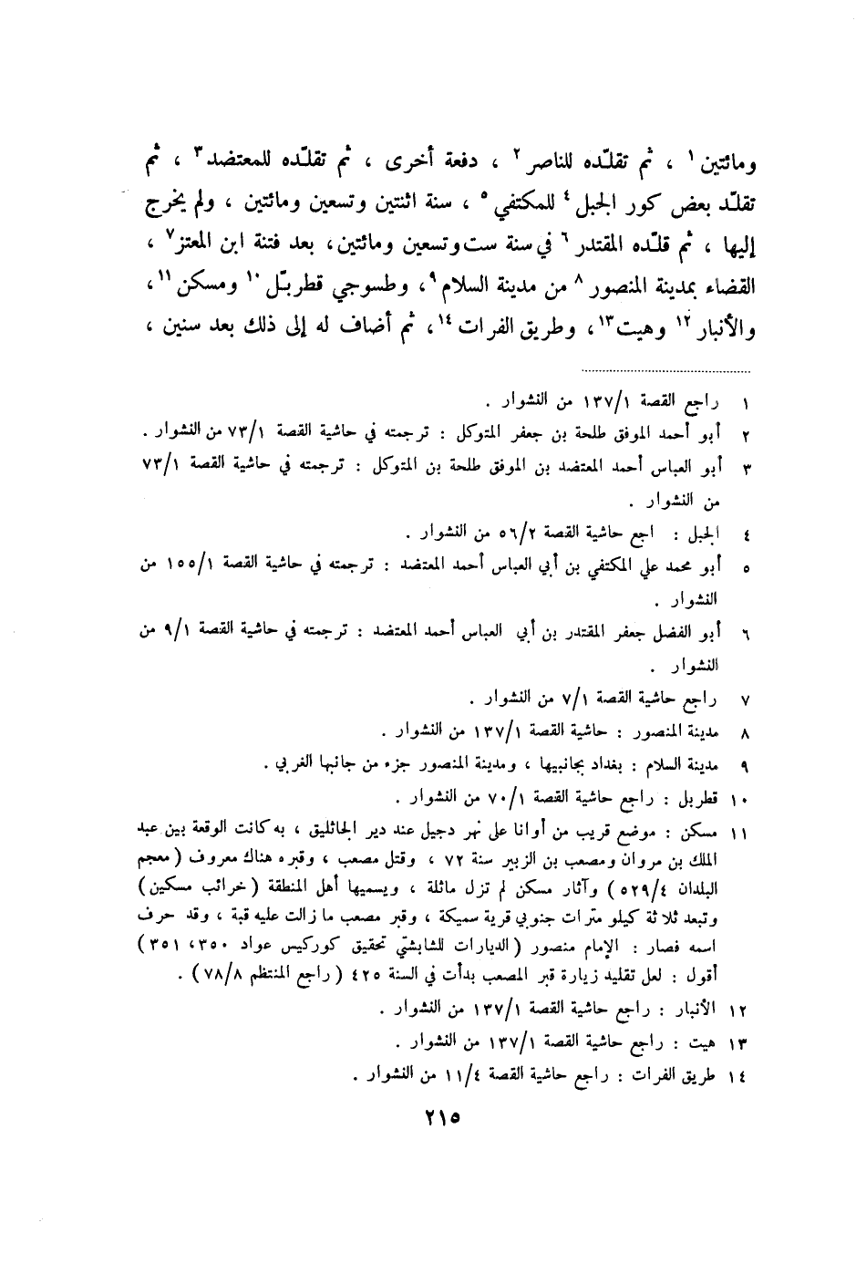 ومائتين «1» ، ثم تقلّده للناصر «2» ، دفعة أخرى، ثم تقلّده للمعتضد «3» ، ثم تقلّد بعض كور الجبل «4» للمكتفي «5» ، سنة اثنتين وتسعين ومائتين، ولم يخرج إليها، ثم قلّده المقتدر «6» في سنة ست وتسعين ومائتين، بعد فتنة ابن المعتز «7» ، القضاء بمدينة المنصور «8» من مدينة السلام «9» ، وطسوجي قطربّل «10» ومسكن «11» ، والأنبار «12» وهيت «13» ، وطريق الفرات «14» ، ثم أضاف له إلى ذلك بعد سنين،