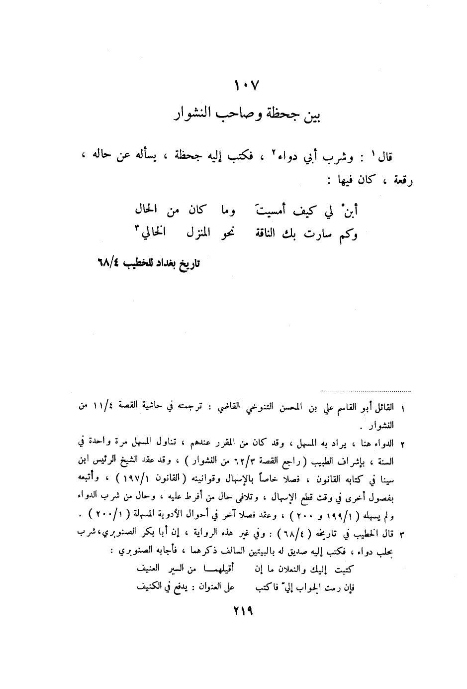 قال «1» : وشرب أبي دواء «2» ، فكتب إليه جحظة، يسأله عن حاله، رقعة، كان فيها: