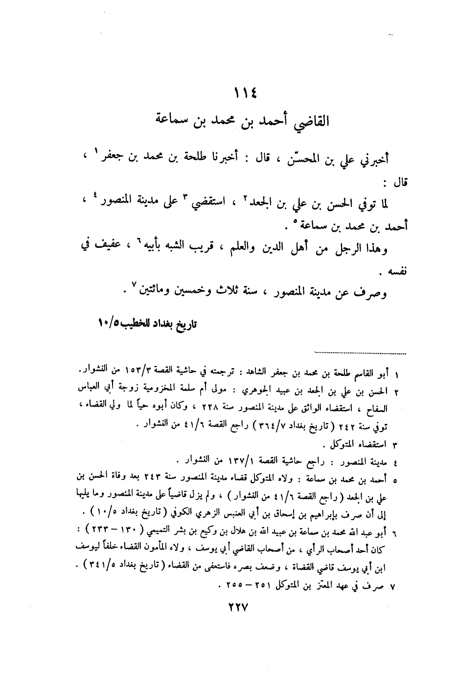 لما توفي الحسن بن علي بن الجعد «2» ، استقضي «3» على مدينة المنصور «4» ، أحمد بن محمد بن سماعة «5» .