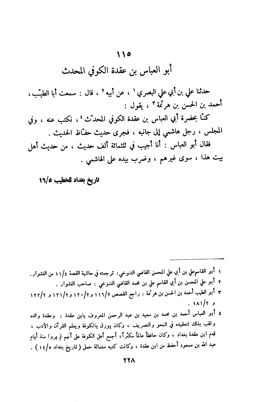 كنّا بحضرة أبي العباس بن عقدة الكوفي المحدّث «4» ، نكتب عنه، وفي المجلس، رجل هاشمي إلى جانبه، فجرى حديث حفّاظ الحديث.