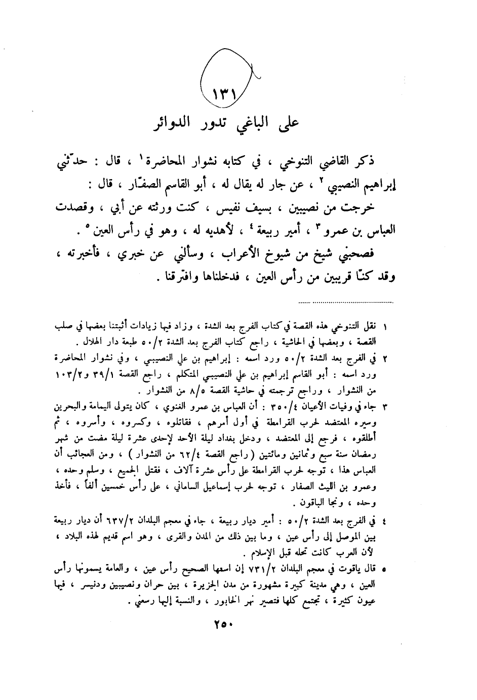 خرجت من نصيبين، بسيف نفيس، كنت ورثته عن أبي، وقصدت العباس بن عمرو «3» ، أمير ربيعة «4» ، لأهديه له، وهو في رأس العين «5» .