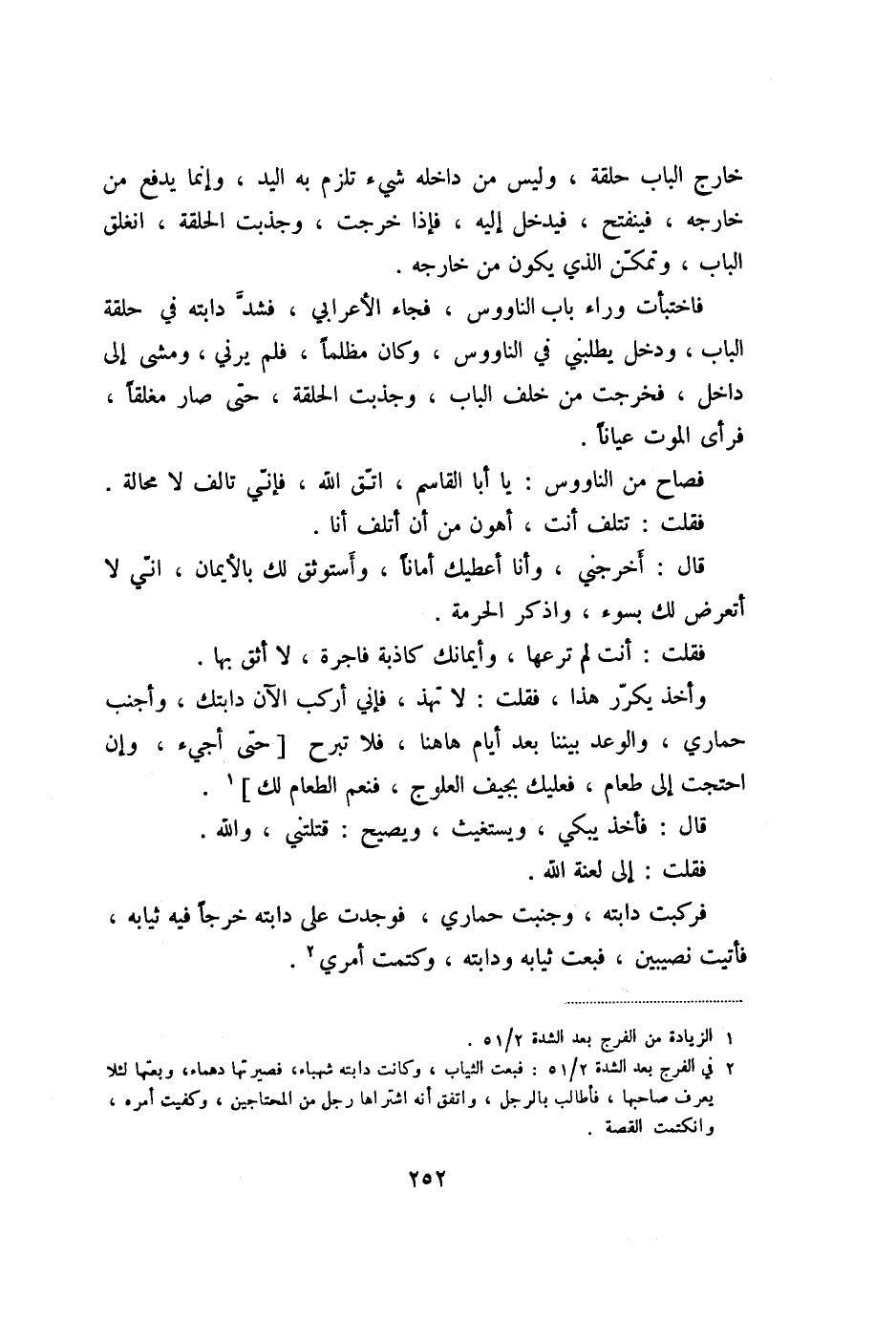 فاختبأت وراء باب الناووس، فجاء الأعرابي، فشدّ دابته في حلقة الباب، ودخل يطلبني في الناووس، وكان مظلما، فلم يرني، ومشى إلى داخل، فخرجت من خلف الباب، وجذبت الحلقة، حتى صار مغلقا، فرأى الموت عيانا.