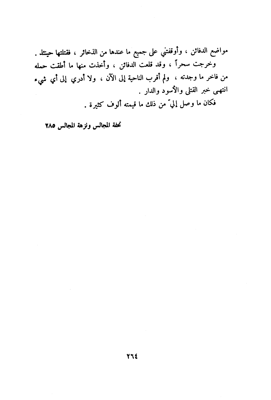 وخرجت سحرا، وقد قلعت الدفائن، وأخذت منها ما أطقت حمله من فاخر ما وجدته، ولم أقرب الناحية إلى الآن، ولا أدري إلى أي شيء انتهى خبر القتلى والأسود والدار.