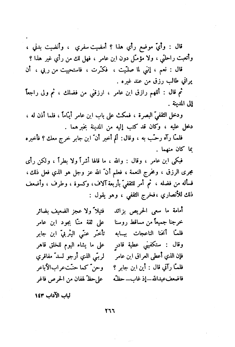 قال: وأيّ موضع رأي هذا؟ أمضيت سفري، وأنضيت بدني، وأتعبت راحلتي، ولا مؤمّل دون ابن عامر، فهل لك من رأي غير هذا؟