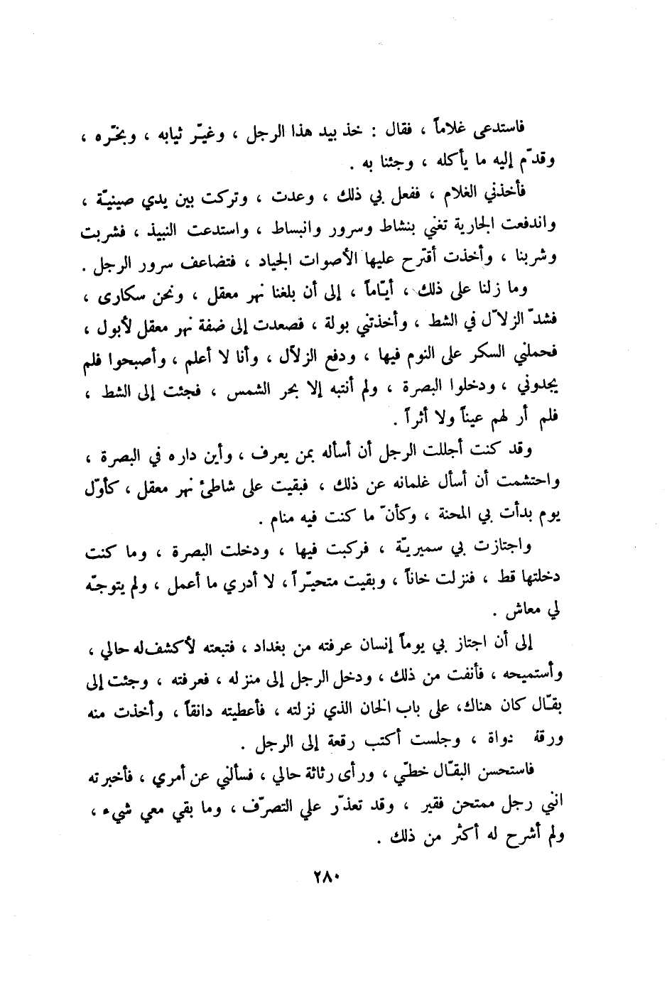 وما زلنا على ذلك، أيّاما، إلى أن بلغنا نهر معقل، ونحن سكارى، فشدّ الزلّال في الشط، وأخذتني بولة، فصعدت إلى ضفة نهر معقل لأبول، فحملني السكر على النوم فيها، ودفع الزلّال، وأنا لا أعلم، وأصبحوا فلم يجدوني، ودخلوا البصرة، ولم أنتبه إلا بحر الشمس، فجئت إلى الشط، فلم أر لهم عينا ولا أثرا.