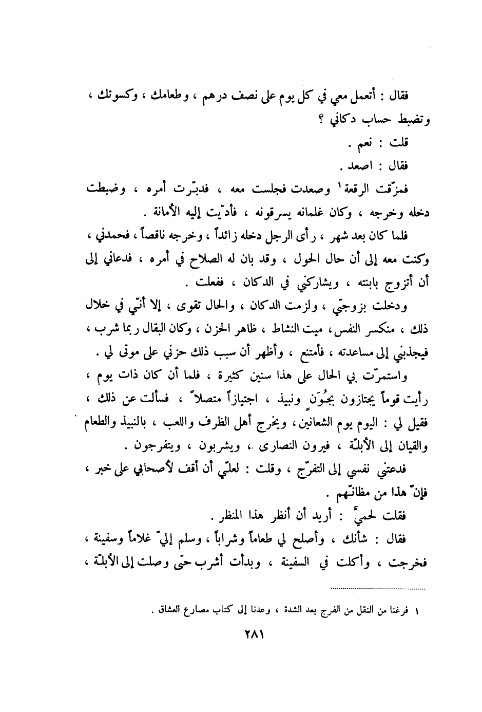 ودخلت بزوجتي، ولزمت الدكان، والحال تقوى، إلا أنّي في خلال ذلك، منكسر النفس، ميت النشاط، ظاهر الحزن، وكان البقال ربما شرب، فيجذبني إلى مساعدته، فأمتنع، وأظهر أن سبب ذلك حزني على موتى لي.
