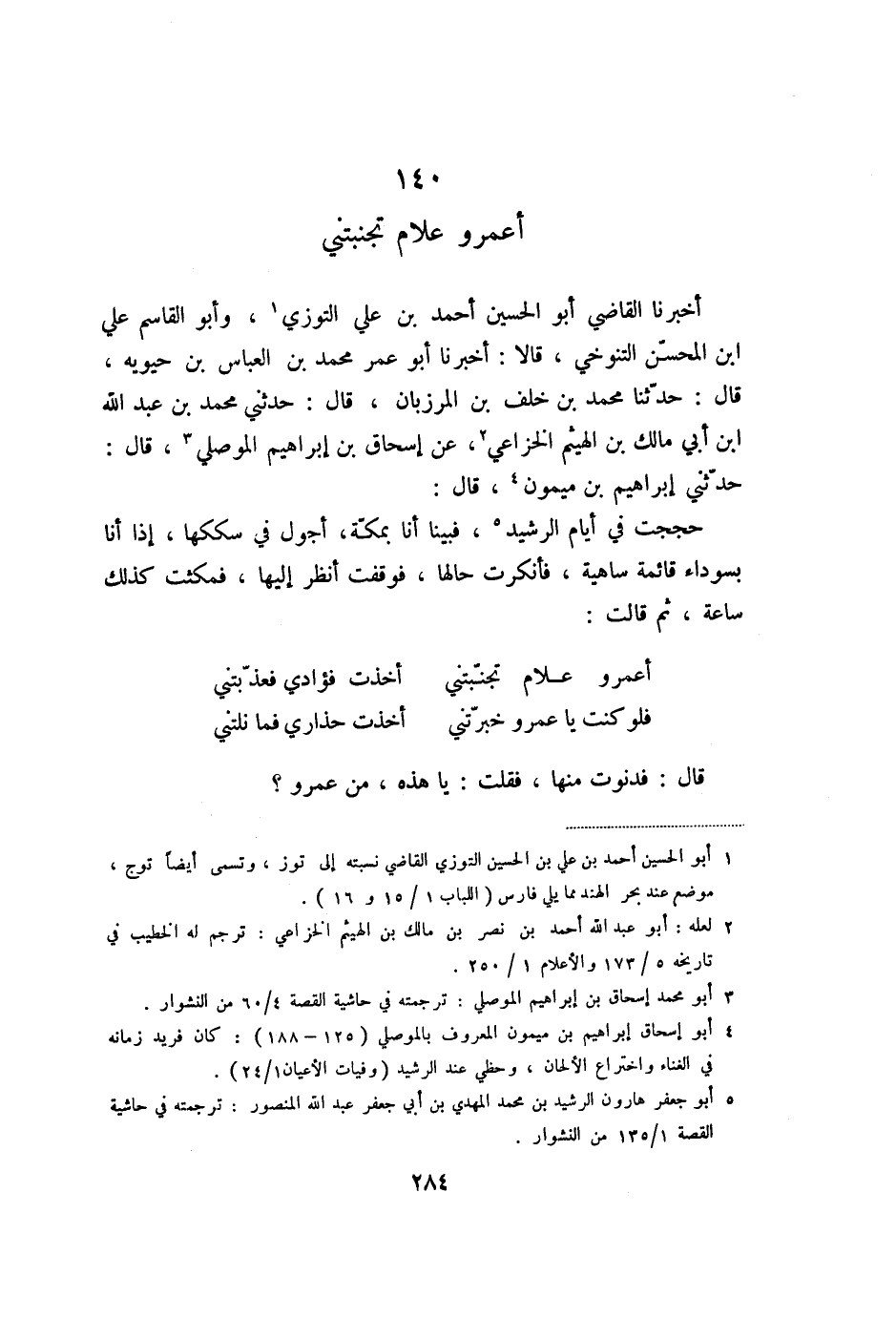 أخبرنا القاضي أبو الحسين أحمد بن علي التوزي «1» ، وأبو القاسم علي ابن المحسّن التنوخي، قالا: أخبرنا أبو عمر محمد بن العباس بن حيويه، قال: حدّثنا محمد بن خلف بن المرزبان، قال: حدثني محمد بن عبد الله ابن أبي مالك بن الهيثم الخزاعي «2» ، عن إسحاق بن إبراهيم الموصلي «3» ، قال: