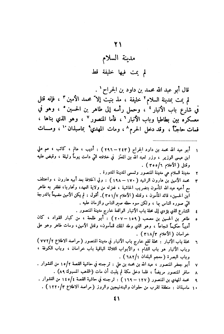 لم يمت بمدينة السلام «2» خليفة، مذ بنيت إلّا محمد الأمين «3» ، فإنه قتل في شارع باب الأنبار «4» ، وحمل رأسه إلى طاهر بن الحسين «5» ، وهو في معسكره بين بطاطيا وباب الأنبار «6» ، فأما المنصور «7» ، وهو الذي بناها، فمات حاجّا، وقد دخل الحرم «8» ، ومات المهدي «9» بماسبذان «10» ، ومات