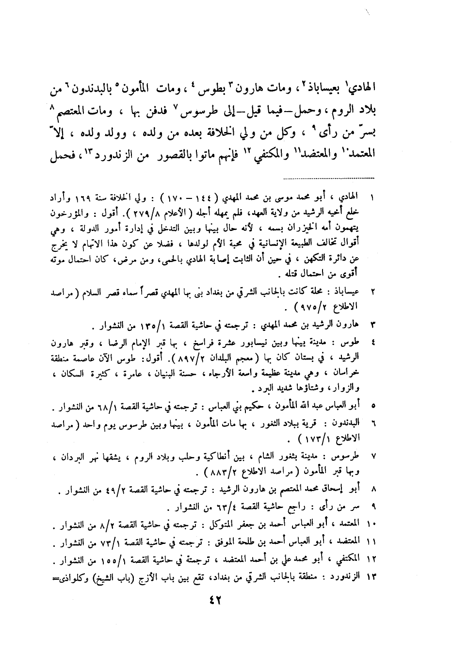 الهادي «1» بعيساباذ «2» ، ومات هارون «3» بطوس «4» ، ومات المأمون «5» بالبدندون «6» من بلاد الروم، وحمل- فيما قيل- إلى طرسوس «7» فدفن بها، ومات المعتصم «8» بسرّ من رأى «9» ، وكل من ولي الخلافة بعده من ولده، وولد ولده، إلّا المعتمد «10» والمعتضد «11» والمكتفي «12» فإنهم ماتوا بالقصور من الزندورد «13» ، فحمل