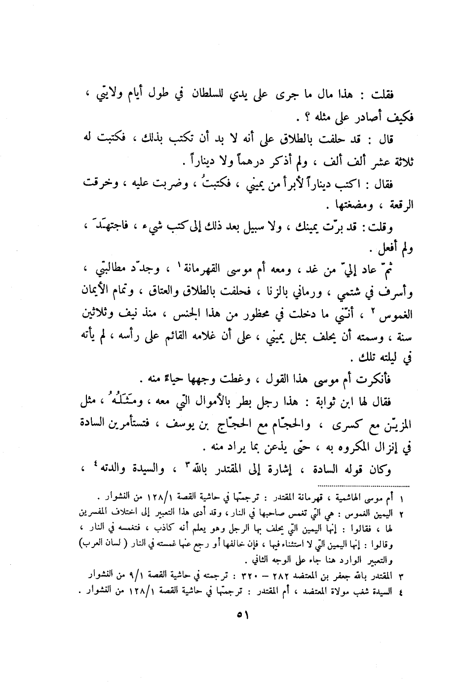 ثمّ عاد إليّ من غد، ومعه أم موسى القهرمانة «1» ، وجدّد مطالبتي، وأسرف في شتمي، ورماني بالزنا، فحلفت بالطلاق والعتاق، وتمام الأيمان الغموس «2» ، أنّني ما دخلت في محظور من هذا الجنس، منذ نيف وثلاثين سنة، وسمته أن يحلف بمثل يميني، على أن غلامه القائم على رأسه، لم يأته في ليلته تلك.