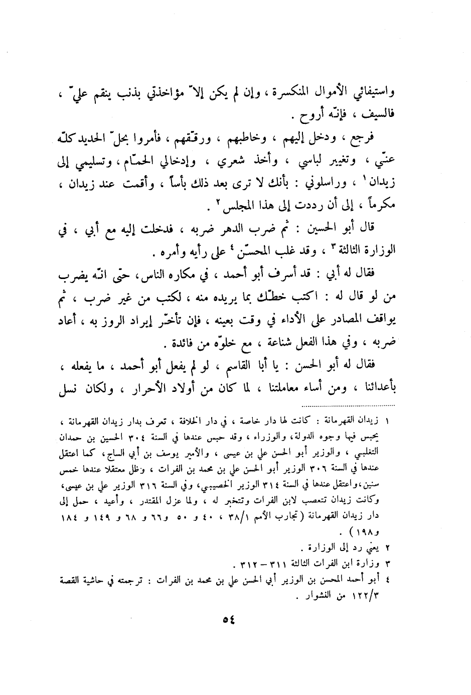 فقال له أبي: قد أسرف أبو أحمد، في مكاره الناس، حتى انّه يضرب من لو قال له: اكتب خطّك بما يريده منه، لكتب من غير ضرب، ثم يواقف المصادر على الأداء في وقت بعينه، فإن تأخّر إيراد الروز به، أعاد ضربه، وفي هذا الفعل شناعة، مع خلوّه من فائدة.