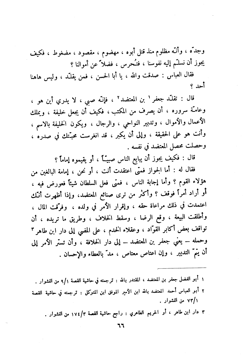 فقال له: أما الجواز فمتى اعتقدت أنت، أو نحن، إمامة البالغين من هؤلاء القوم؟ وأما إجابة الناس، فمتى فعل السلطان شيئا فعورض فيه، أو أراد أمرا فوقف؟ وأكثر من ترى صنائع المعتضد، وإذا أظهرت أنّك اعتمدت في ذلك مراعاة حقه، وإقرار الأمر في ولده، وفرّقت المال، وأطلقت البيعة، وقع الرضا، وسقط الخلاف، وطريق ما تريده، أن تواقف بعض أكابر القوّاد، وعقلاء الخدم، على المضي إلى دار ابن طاهر «3» وحمله- يعني جعفر بن المعتضد- إلى دار الخلافة، وأن تستر الأمر إلى أن يتمّ التدبير، وإن اعتاص معتاص، مدّ بالعطاء والإحسان.