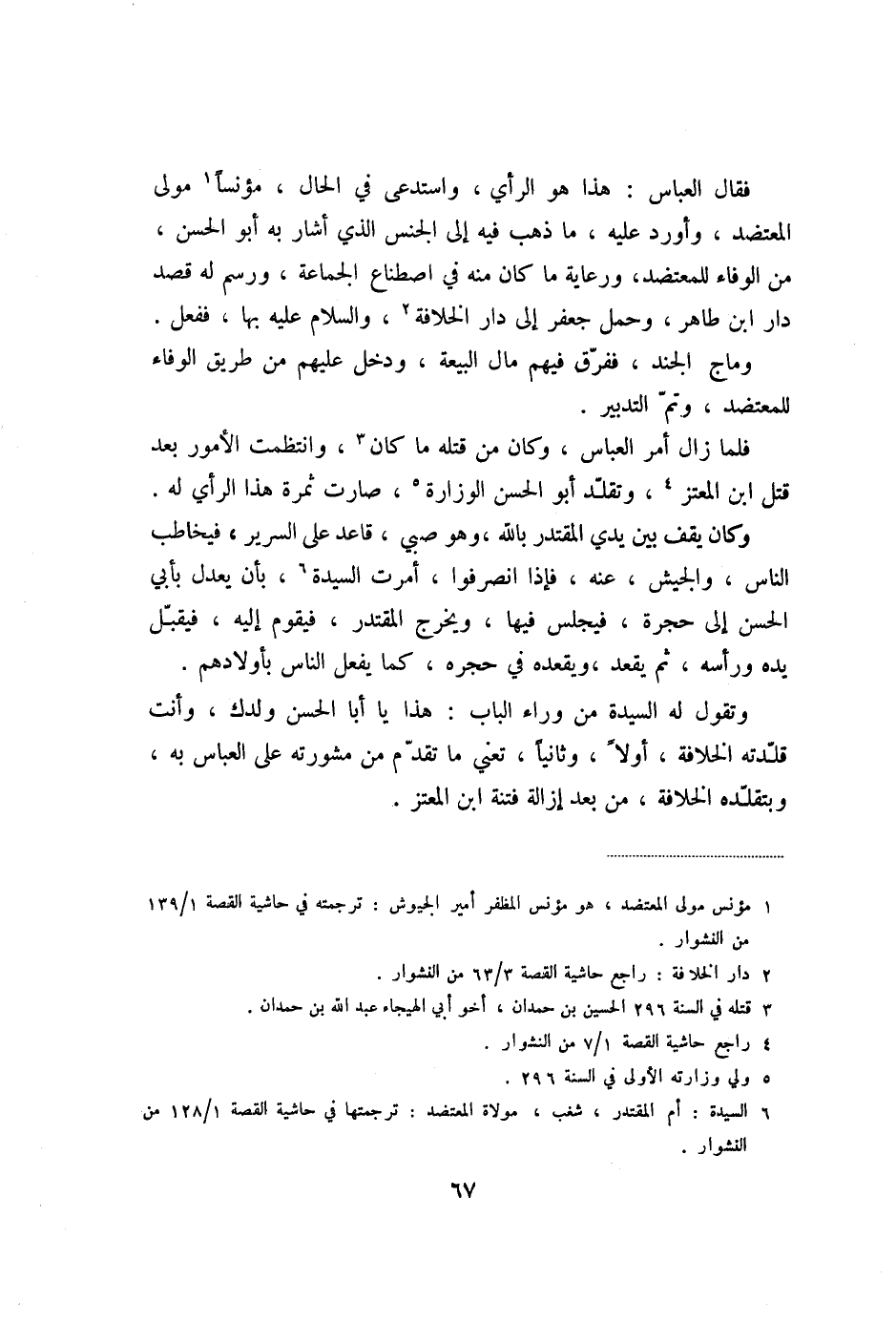 فقال العباس: هذا هو الرأي، واستدعى في الحال، مؤنسا «1» مولى المعتضد، وأورد عليه، ما ذهب فيه إلى الجنس الذي أشار به أبو الحسن، من الوفاء للمعتضد، ورعاية ما كان منه في اصطناع الجماعة، ورسم له قصد دار ابن طاهر، وحمل جعفر إلى دار الخلافة «2» ، والسلام عليه بها، ففعل.