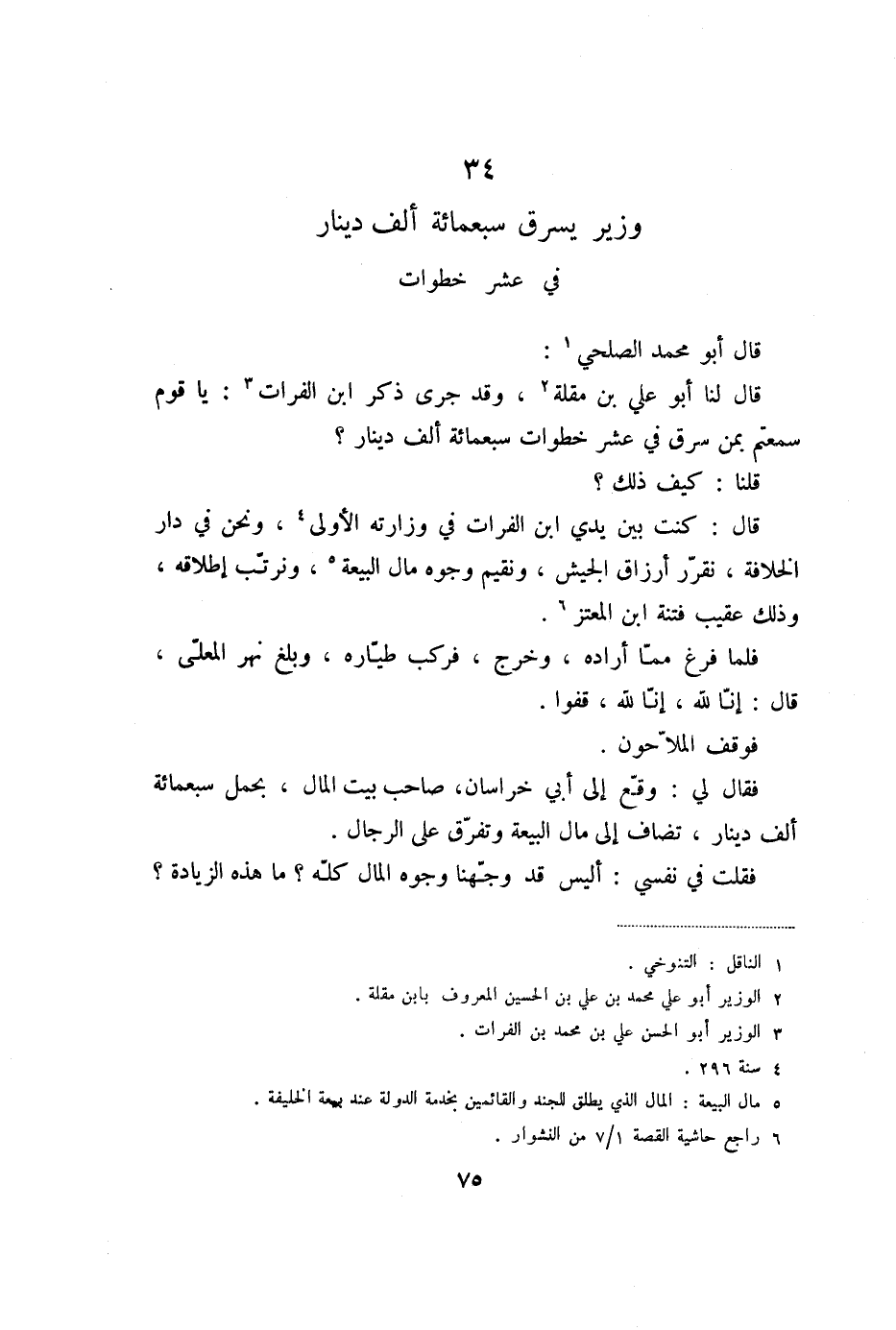 قال لنا أبو علي بن مقلة «2» ، وقد جرى ذكر ابن الفرات «3» : يا قوم سمعتم بمن سرق في عشر خطوات سبعمائة ألف دينار؟