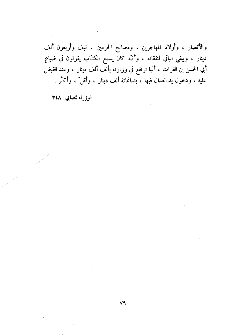 والأنصار، وأولاد المهاجرين، ومصالح الحرمين، نيف وأربعون ألف دينار، ويبقي الباقي لنفقاته، وأنّه كان يسمع الكتّاب يقولون في ضياع أبي الحسن بن الفرات، أنها ترتفع في وزارته بألف دينار، وعند القبض عليه، ودخول يد العمال فيها، بثمانمائة ألف دينار، وأقلّ، وأكثر.