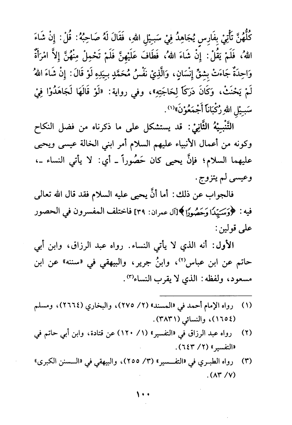 فالجواب عن ذلك: أما أنَّ يحيى عليه السلام فقد قال الله تعالى فيه: {وَسَيِّدًا وَحَصُورًا} [آل عمران: 39] فاختلف المفسرون في الحصور على قولين: