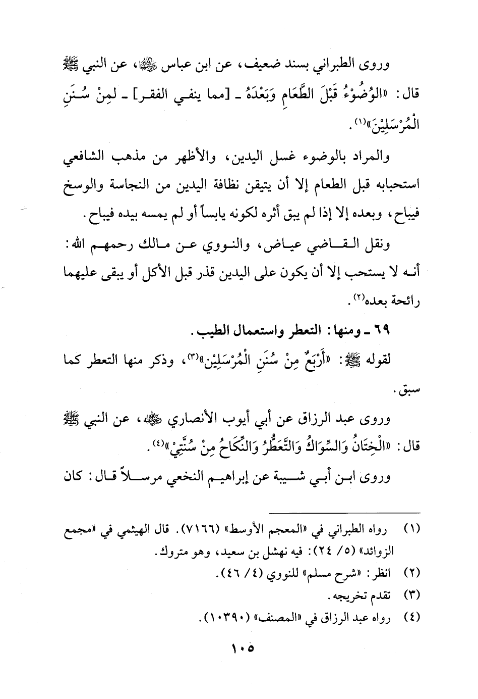 وروى الطبراني بسند ضعيف، عن ابن عباس - رضي الله عنه -، عن النبي - صلى الله عليه وسلم - قال: "الوُضُوْءُ قَبْلَ الطَّعَامِ وَبَعْدَهُ -[مما ينفي الفقر]- لمِنْ سُنَنِ الْمُرْسَلِيْنَ" (¬1).