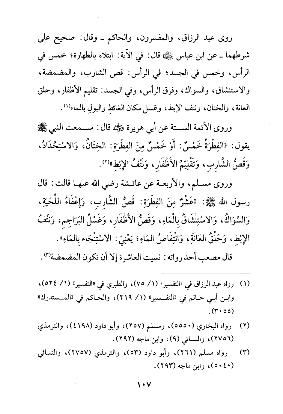 روى عبد الرزاق، والمفسرون، والحاكم - وقال: صحيح على شرطهما - عن ابن عباس - رضي الله عنه - قال: في الآية: ابتلاه بالطهارة؛ خمس في الرأس، وخمس في الجسد؛ في الرأس: قص الشارب، والمضمضة، والاستنشاق، والسواك، وفرق الرأس، وفي الجسد: تقليم الأظفار، وحلق العانة، والختان، ونتف الإبط، وغسل مكان الغائطِ والبولِ بالماء (¬1).