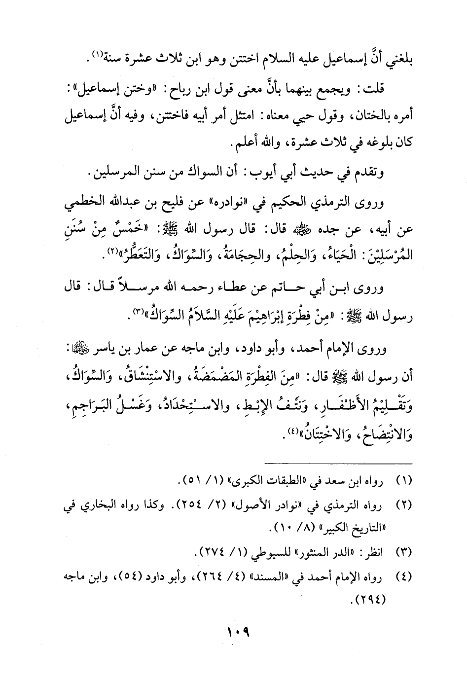 وروى الإمام أحمد، وأبو داود، وابن ماجه عن عمار بن ياسر - رضي الله عنهما -: أن رسول الله - صلى الله عليه وسلم - قال: "مِنَ الفِطْرَةِ المَضْمَضَةُ، والاسْتِنْشَاقُ، وَالسِّوَاكُ، وَتَقْلِيْمُ الأَظْفَارِ، وَنتفُ الإِبْطِ، والاسْتِحْدَادُ، وَغَسْلُ البَرَاجِمِ، وَالانْتِضَاحٌ، وَالاخْتِتَانُ" (¬4).