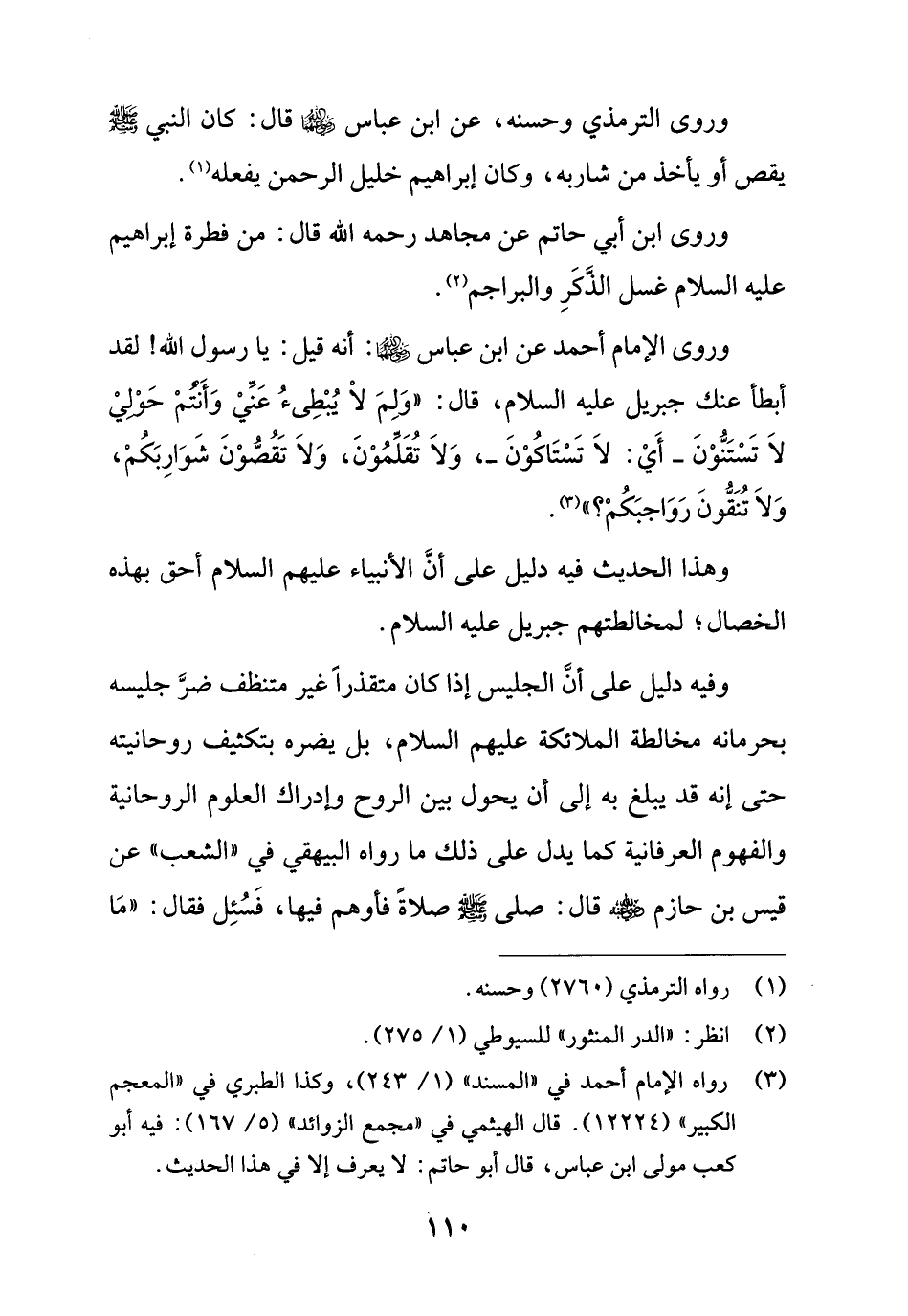 وروى الإمام أحمد عن ابن عباس - رضي الله عنهما -: أنه قيل: يا رسول الله! لقد أبطأ عنك جبريل عليه السلام، قال: "وَلِمَ لا يُبْطِئُ عَنِّيْ وَأَنَتُمْ حَوْليْ لاَ تَسْتَنُّوْنَ - أَيْ: لاَ تَسْتَاكُوْنَ -، وَلاَ تُقَلّمُوْنَ، وَلاَ تَقُصُّوْنَ شَوَارِبَكُمْ، وَلاَ تُنَقُّونَ رَوَاجبَكُمْ؟ " (¬3).