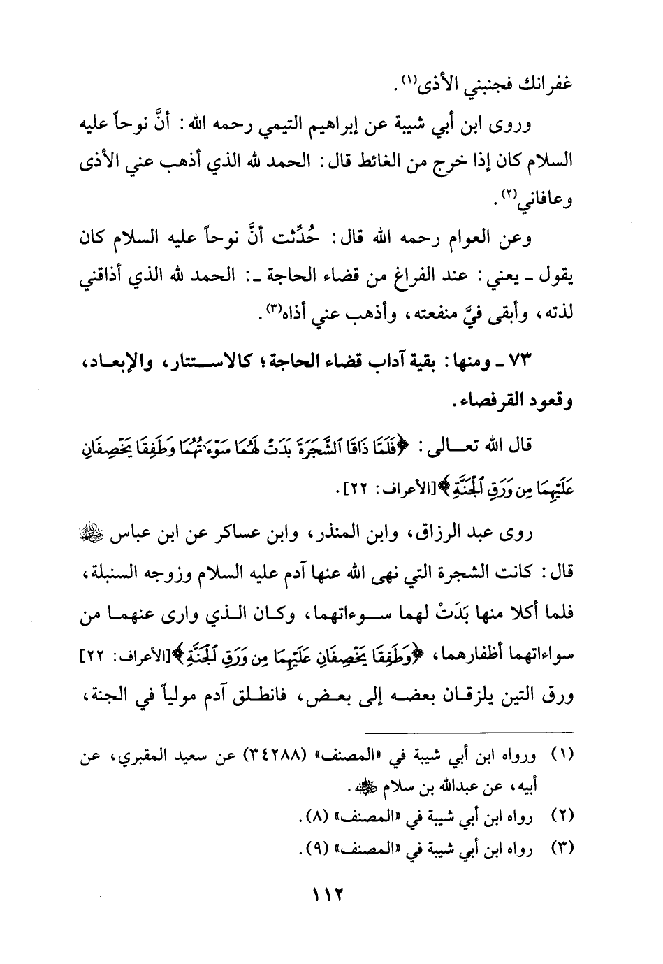 وعن العوام رحمه الله قال: حُدِّثت أنَّ نوحاً عليه السلام كان يقول - يعني: عند الفراغ من قضاء الحاجة -: الحمد لله الذي أذاقني لذته، وأبقى فيَّ منفعته، وأذهب عني أذاه (¬3).