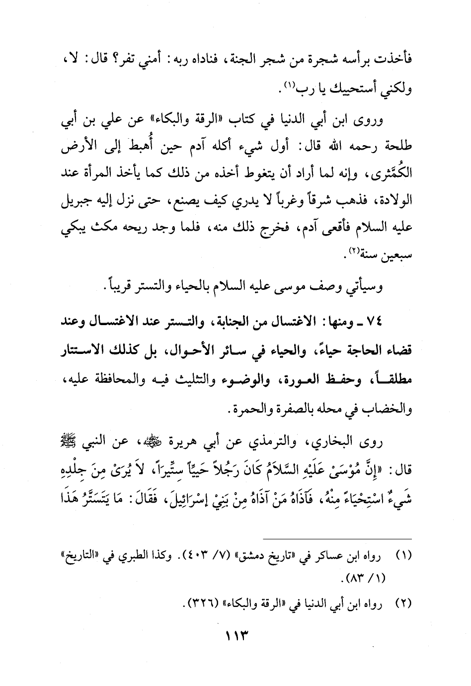74 - ومنها: الاغتسال من الجنابة، والتستر عند الاغتسال وعند قضاء الحاجة حياءً، والحياء في سائر الأحوال، بل كذلك الاستتار مطلقاً، وحفظ العورة، والوضوء والتثليث فيه والمحافظة عليه، والخضاب في محله بالصفرة والحمرة.