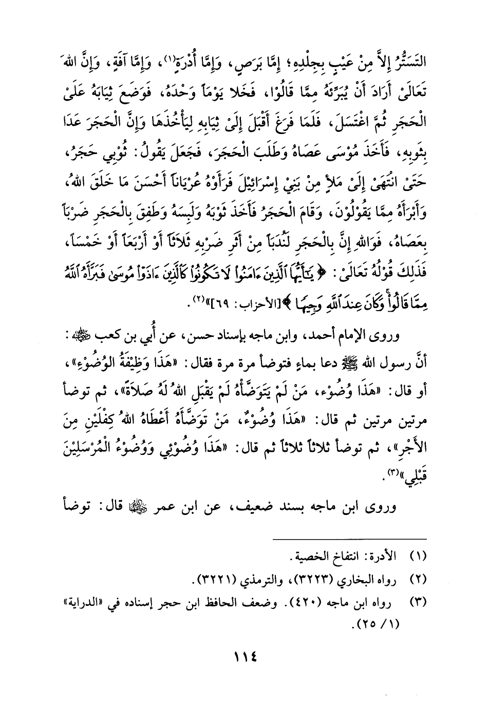 وروى الإمام أحمد، وابن ماجه بإسناد حسن، عن أُبي بن كعب - رضي الله عنه -: أنَّ رسول الله - صلى الله عليه وسلم - دعا بماءٍ فتوضأ مرة مرة فقال: "هَذَا وَظِيْفَةُ الوُضُوْءِ"، أو قال: "هَذَا وُضُوْء، مَنْ لَمْ يَتَوَضَّأْهُ لَمْ يَقْبَلِ اللهُ لَهُ صَلاَةً"، ثم توضأ مرتين مرتين ثم قال: "هَذَا وُضُوْءٌ، مَنْ تَوَضَّأَهُ أَعْطَاهُ اللهُ كِفْلَيْنِ مِنَ الأَجْر"، ثم توضأ ثلاثاً ثلاثاً ثم قال: "هَذَا وُضُوْئِي وَوُضُوْءُ الْمُرْسَلِيْنَ قَبْلِي" (¬3).