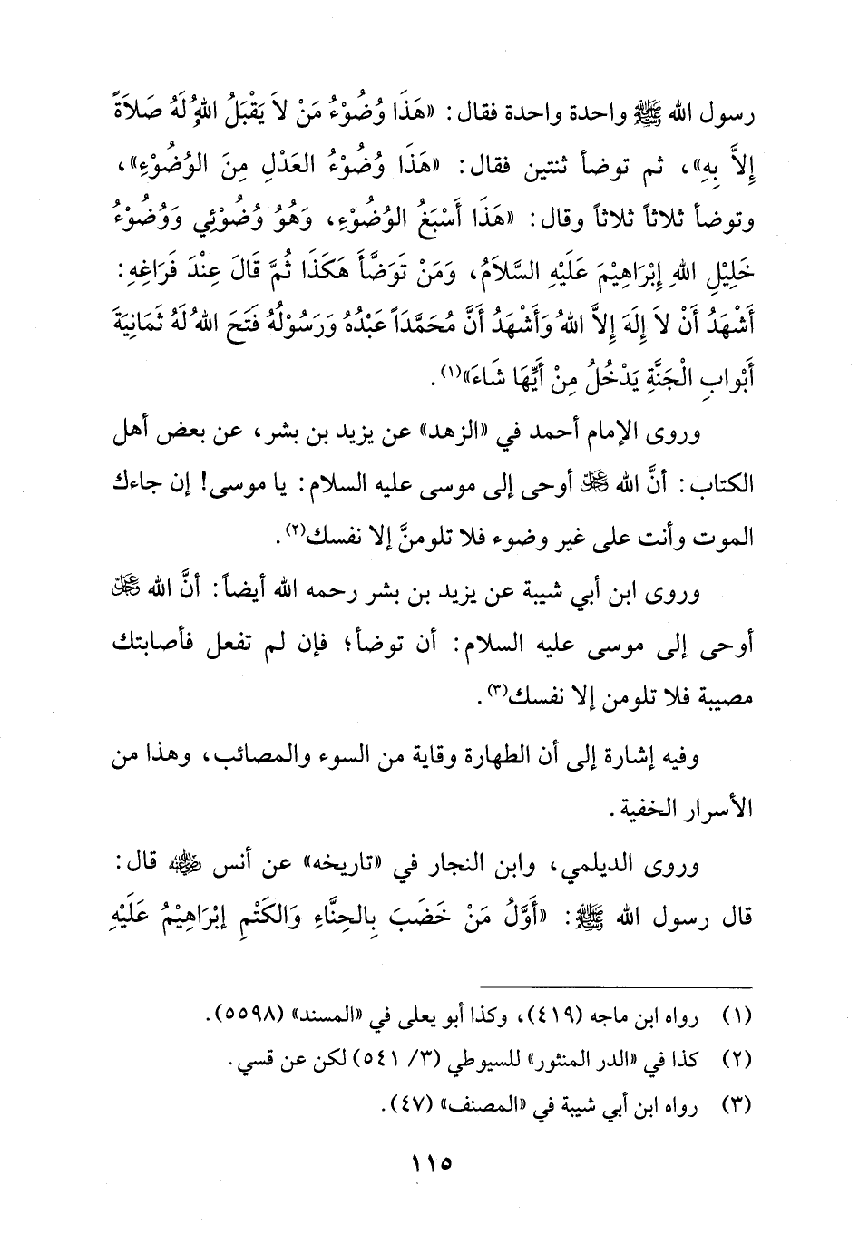 وروى ابن أبي شيبة عن يزيد بن بشر رحمه الله أيضاً: أنَّ الله - عز وجل - أوحى إلى موسى عليه السلام: أن توضأ؛ فإن لم تفعل فأصابتك مصيبة فلا تلومن إلا نفسك (¬3).