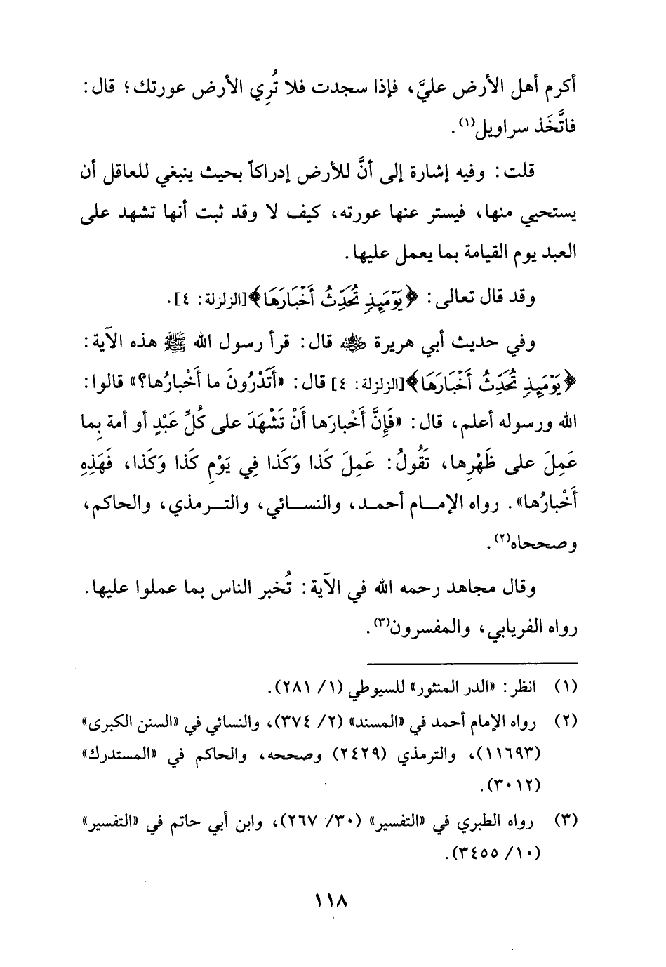 وفي حديث أبي هريرة - رضي الله عنه - قال: قرأ رسول الله - صلى الله عليه وسلم - هذه الآية: {يَوْمَئِذٍ تُحَدِّثُ أَخْبَارَهَا} [الزلزلة: 4] قال: "أتدْرُونَ ما أَخْبارُها؟ " قالوا: الله ورسوله أعلم، قال: "فَإِنَّ أَخْبارَها أَنْ تَشْهَدَ على كُلِّ عَبدٍ أو أمة بِما عَمِلَ على ظَهْرِها، تَقُولُ: عَمِلَ كَذا وَكَذا فِي يَوْمِ كَذا وَكَذا، فَهَذهِ أَخْبارُها". رواه الإمام أحمد، والنسائي، والترمذي، والحاكم، وصححاه (¬2).
