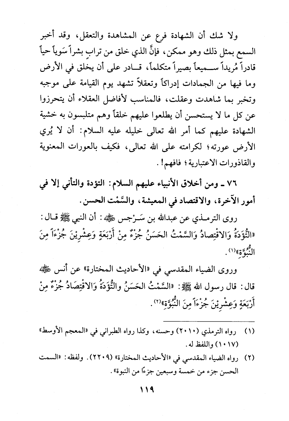 روى الترمذي عن عبد الله بن سَرْجس - رضي الله عنه -: أن النبي - صلى الله عليه وسلم - قال: "التُّؤَدَةُ وَالاقْتِصادُ وَالسَّمْتُ الحَسَنُ جُزْءٌ مِنْ أَرْبَعَةٍ وَعِشْرِيْنَ جُزْءًا مِنَ النّبُوَّةِ" (¬1).