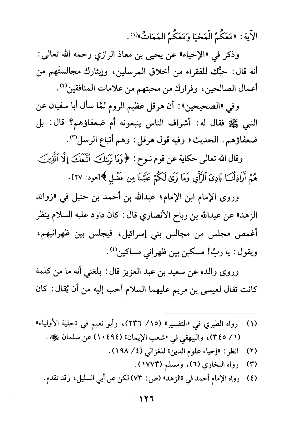 وذكر في "الإحياء" عن يحيى بن معاذ الرازي رحمه الله تعالى: أنه قال: حبُّك للفقراء من أخلاق المرسلين، وإيثارك مجالستَهم من أعمال الصالحين، وفرارك من محبتهم من علامات المنافقين (¬2).