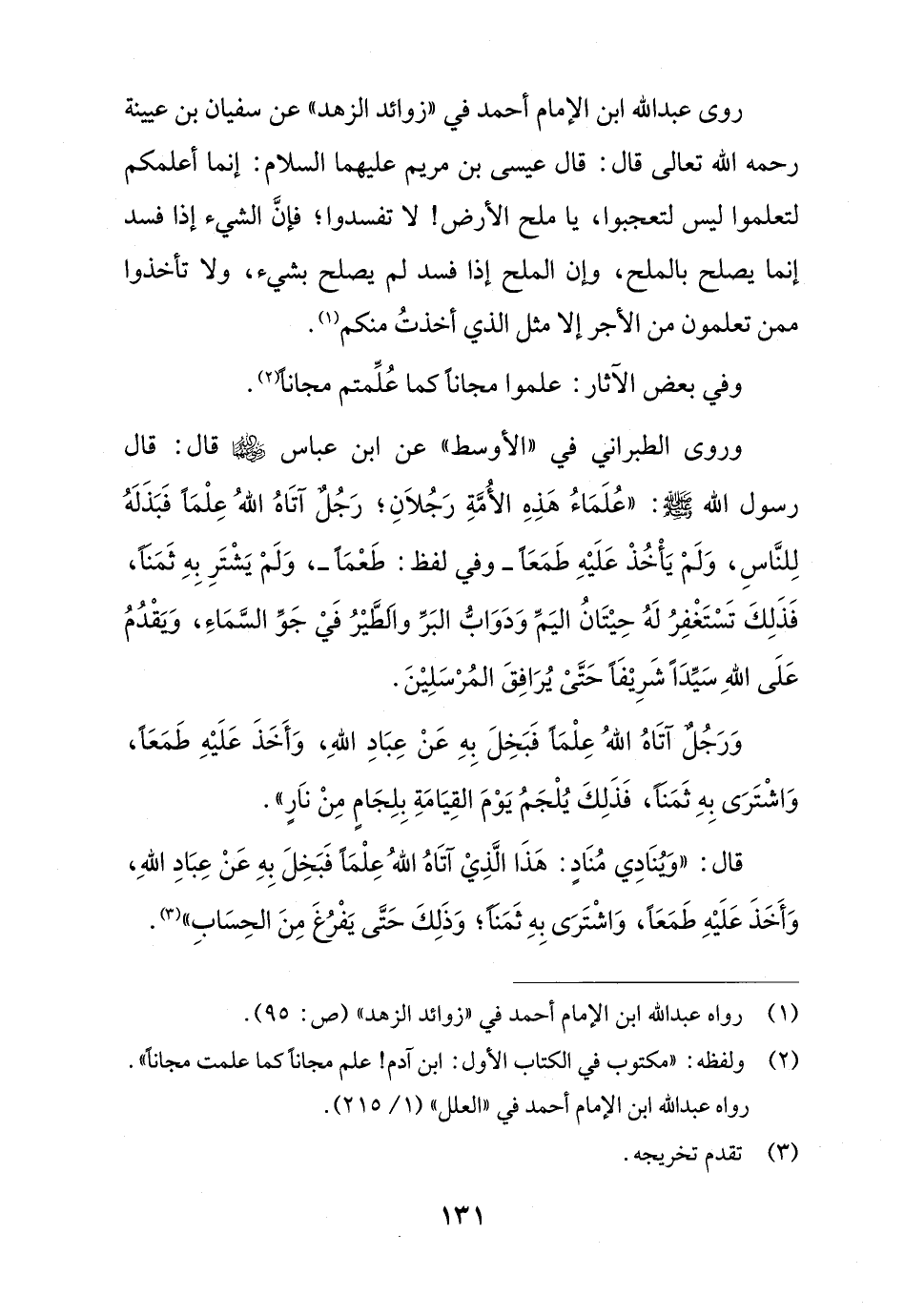 روى عبد الله ابن الإمام أحمد في "زوائد الزهد" عن سفيان بن عيينة رحمه الله تعالى قال: قال عيسى بن مريم عليهما السلام: إنما أعلمكم لتعلموا ليس لتعجبوا، يا ملح الأرض! لا تفسدوا؛ فإنَّ الشيء إذا فسد إنما يصلح بالملح، وإن الملح إذا فسد لم يصلح بشيء، ولا تأخذوا ممن تعلمون من الأجر إلا مثل الذي أخذتُ منكم (¬1).