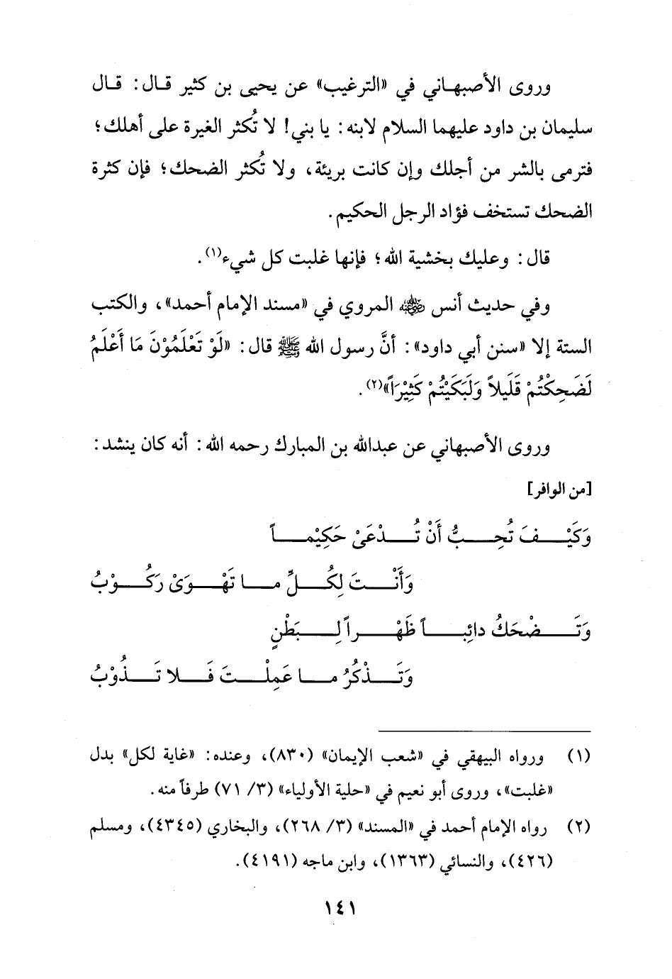 وروى الأصبهاني عن عبد الله بن المبارك رحمه الله: أنه كان ينشد: [من الوافر]