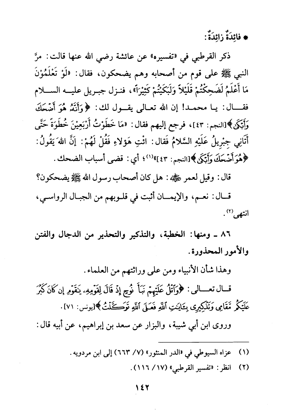 ذكر القرطبي في "تفسيره" عن عائشة رضي الله عنها قالت: مرَّ النبي - صلى الله عليه وسلم - على قوم من أصحابه وهم يضحكون، فقال: "لَوْ تَعْلَمُوْنَ مَا أَعْلَمُ لَضَحِكْتُمْ قَلَيْلاً وَلَبَكَيْتُمْ كَثِيْرًا"، فنزل جبريل عليه السلام فقال: يا محمد! إن الله تعالى يقول لك: {وَأَنَّهُ هُوَ أَضْحَكَ وَأَبْكَى} [النجم: 43]، فرجع إليهم فقال: "مَا خَطَوْتُ أَرْبَعِيْنَ خُطَوَةً حَتَّى أتانِي جِبْرِيلُ عَلَيْهِ السَّلامُ فَقال: ائْتِ هَؤلاءِ فَقُلْ لَهُمْ: إَنَّ اللهَ يَقُولُ: {وَأَنَّهُ هُوَ أَضْحَكَ وَأَبْكَى} [النجم: 43] (¬1)؛ أي: قضى أسباب الضحك.