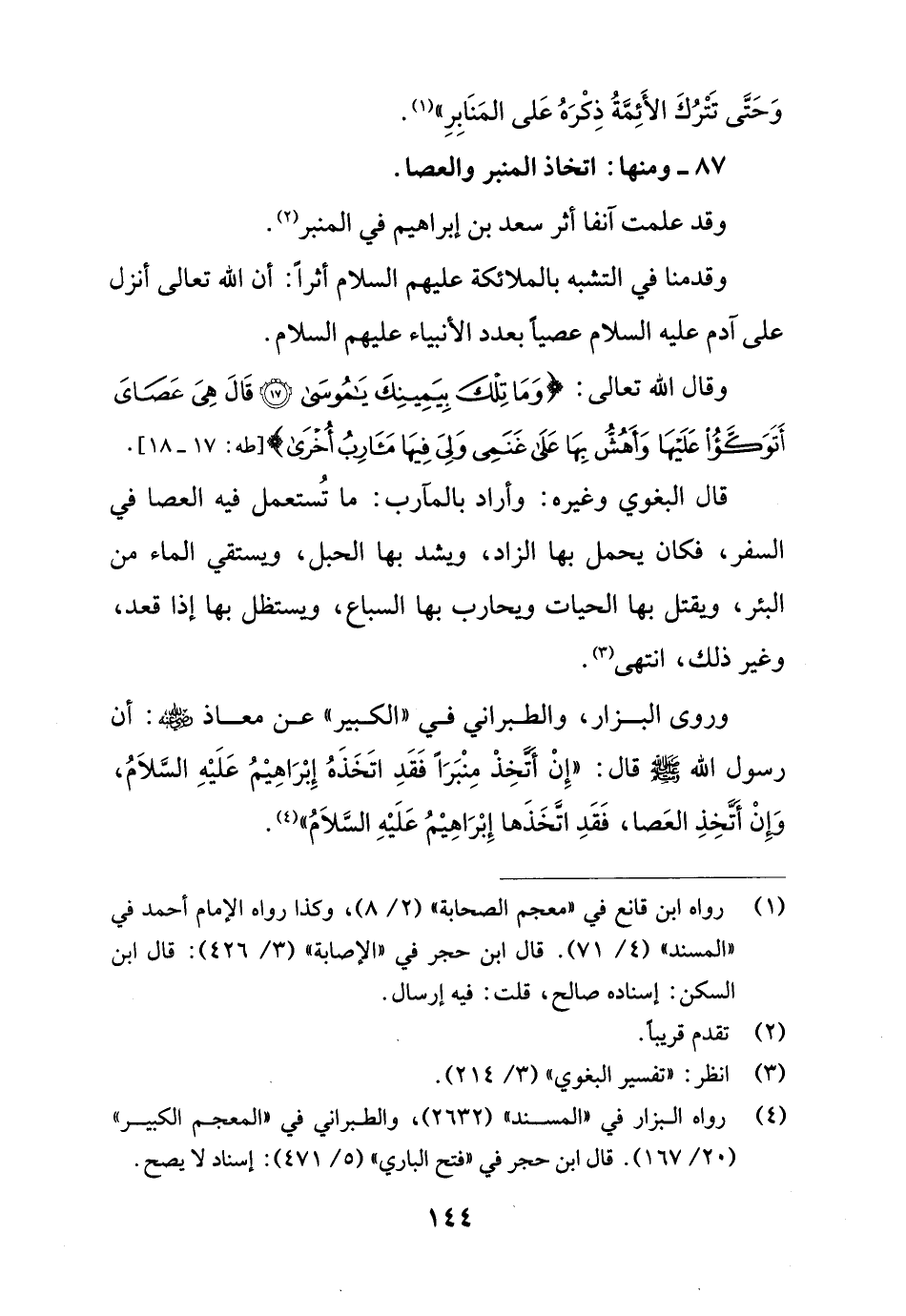 وروى البزار، والطبراني في "الكبير" عن معاذ - رضي الله عنه -: أن رسول الله - صلى الله عليه وسلم - قال: "إِنْ أتَّخِذْ مِنْبَرًا فَقَدِ اتَّخَذَهُ إِبْرَاهِيْمُ عَلَيْهِ السَّلاَمُ، وإنْ أتَّخِذِ العَصا، فَقَدِ اتَّخَذها إِبْرَاهِيْمُ عَلَيْهِ السَّلاَمُ" (¬4).