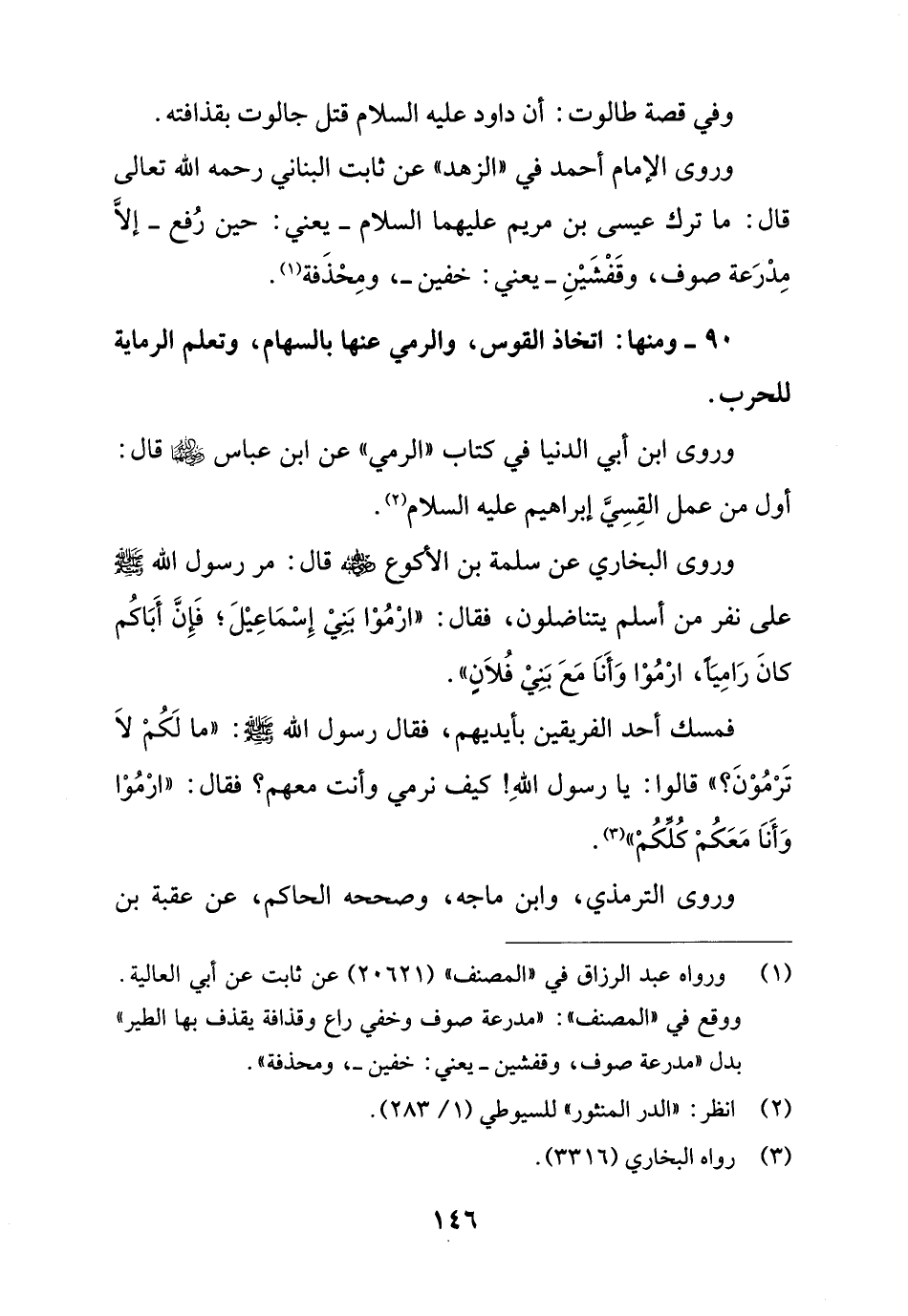 90 - ومنها: اتخاذ القوس، والرمي عنها بالسهام، وتعلم الرماية للحرب.