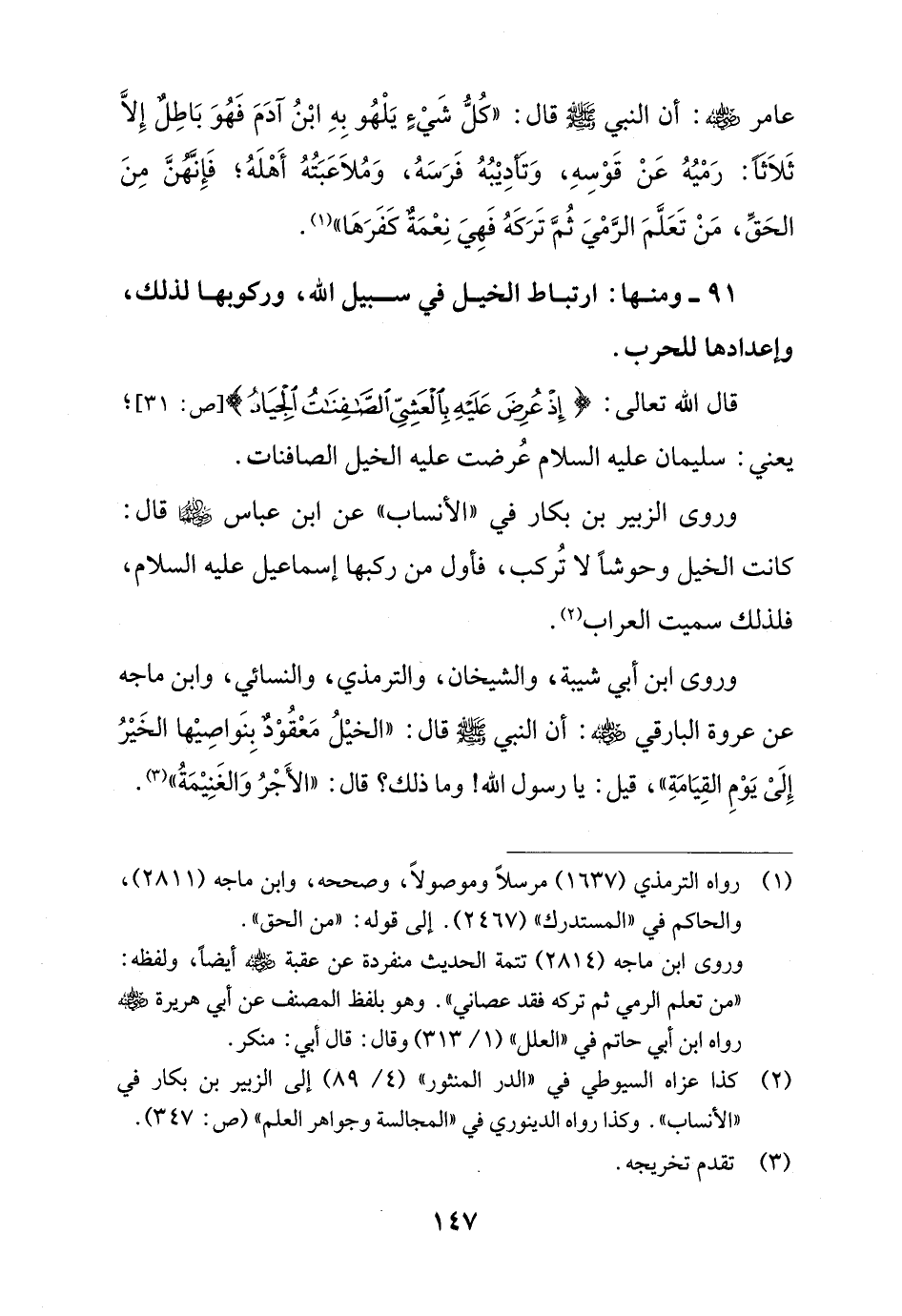 91 - ومنها: ارتباط الخيل في سبيل الله، وركوبها لذلك، وإعدادها للحرب.
